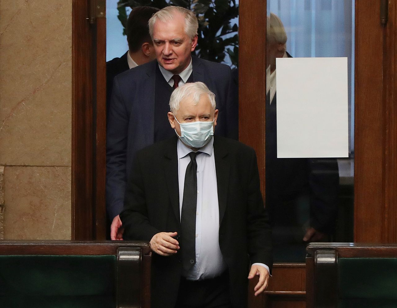 PiS-Führer Jaroslaw Kaczyński und Jarosław Gowin im Parlament bei der Debatte über Schutzmaßnahmen für die auf Sommer verschobene Präsidentschaftswahl, 12. Mai 2020. (AP Photo/Czarek Sokolowski)