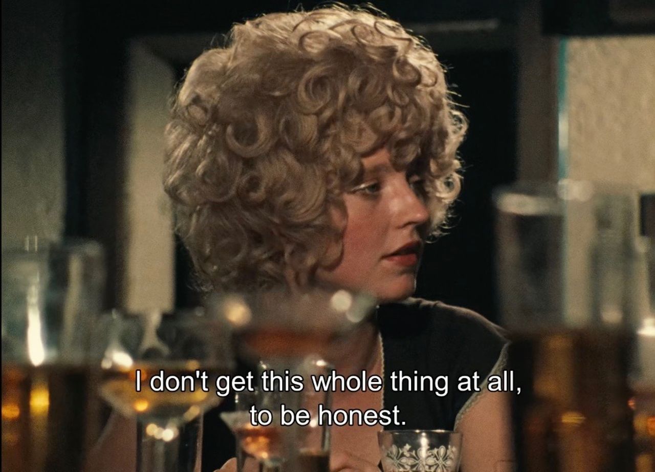 The camera then takes in Marion (Schygulla), seated at the opposite end of the table. For the first time in the sequence, our view of a character is partially obstructed. The shot includes her face, but the bottom third or so of the frame is taken up by beer and other kinds of glasses. Marion slowly, almost sadly, begins to speak, looking down at the table. “I don’t get this whole thing at all, to be honest,” she says, before urging the workers to place their own demands on management. The frame communicates the physical and mental difficulty, as well as the necessity, of seeing through things and of acting in the face of obstacles. It is an affecting, moving moment.