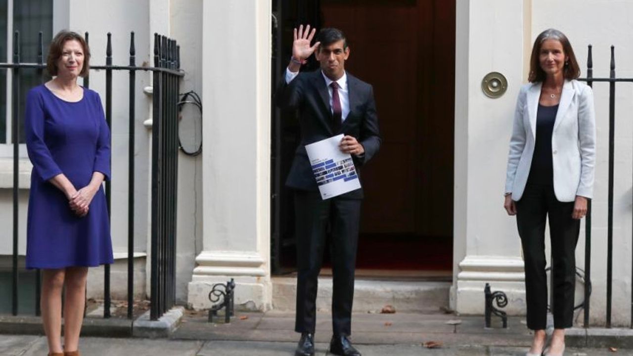 Britain’s Chancellor of the Exchequer Rishi Sunak (centre) with Frances O'Grady, General Secretary of the Trades Union Congress (left) and (right) Dame Carolyn Julie Fairbairn, Director General of the CBI, London, September 24, 2020 [Credit: AP Photo/Frank Augstein]