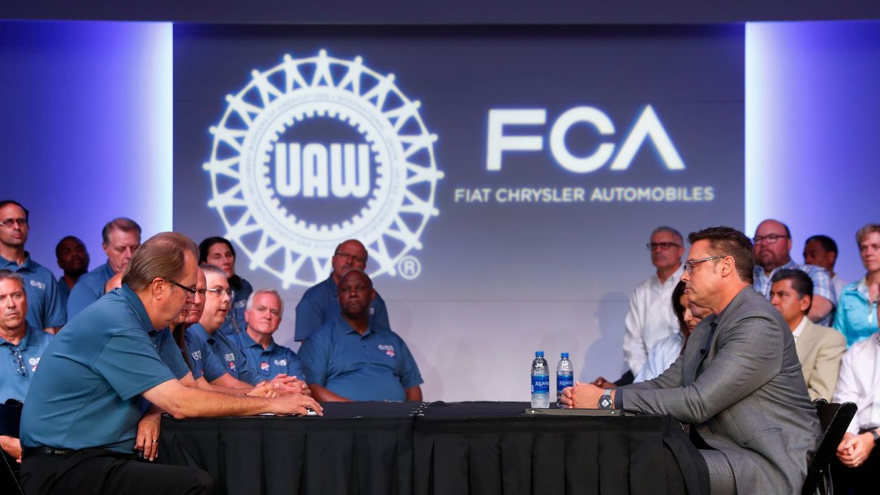 Gary Jones (left) former UAW President and Mark Stewart, CEO, Fiat Chrysler Automobiles North America speak at the opening of their contract talks in Auburn Hills, Michigan [Credit: AP Photo/Paul Sancya]