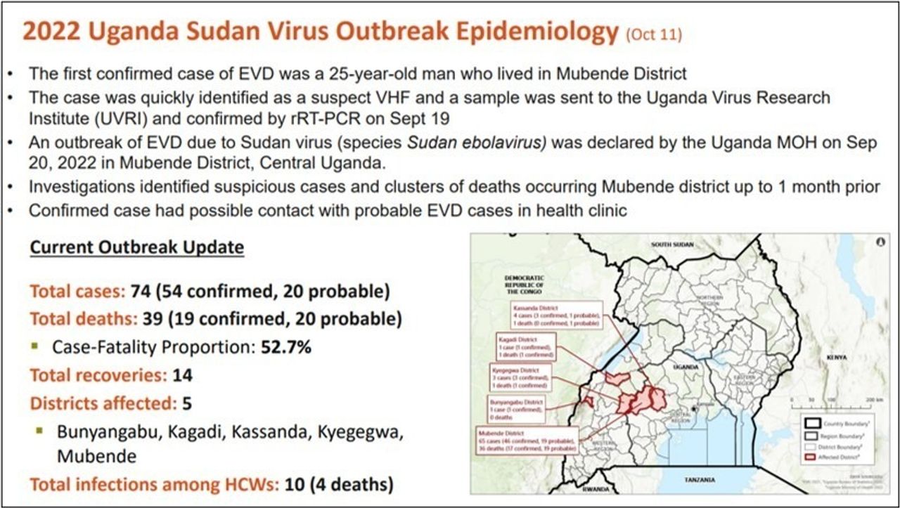 He added, “As for the geographical distribution, the main epicenter of the outbreak is Mubende district, which is near the center of Uganda. But within that, we have five subcounties [where cases have mainly occurred]. We are looking at a span of 70 kilometers from one end to the other. For the disease clusters within the subcounties, we are looking at a distance of up to 30 km. The breadth of response is the whole country. We are hoping to extend the response across the 11 districts surrounding the one at the epicenter.”