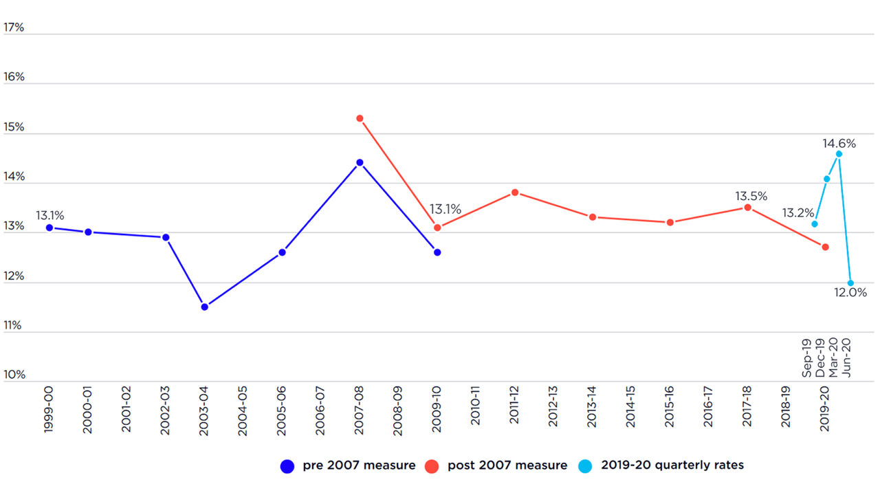 The federal government also enacted stimulus spending measures, to offset negative economic effects of rising joblessness and declining retail and hospitality spending. These measures included boosting income support payments from June 2020. People on any type of welfare allowance received a meagre $750 Economic Support Payment, while people on unemployment-related payments received a $275 per week Coronavirus Supplement. Despite the limited character of these payments, they represented a near doubling of unemployed workers’ incomes.