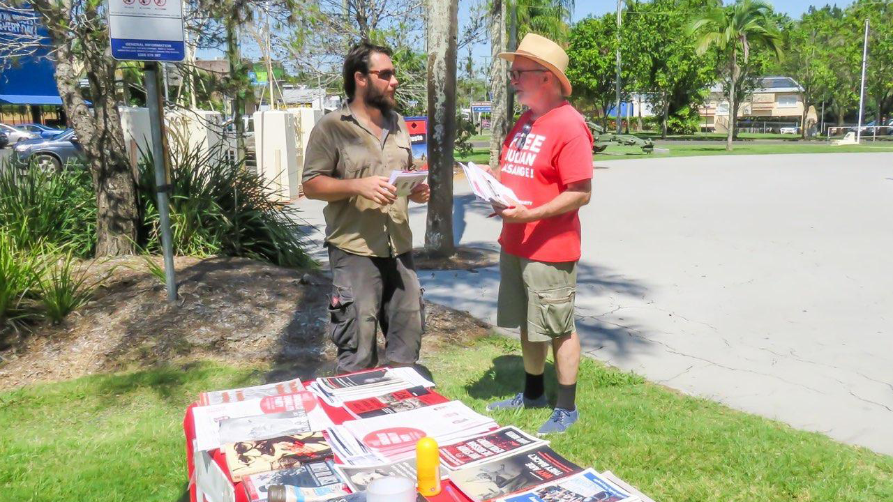 SEP candidate Mike Head in discussion with a worker at a rally in Lismore to defend Julian Assange