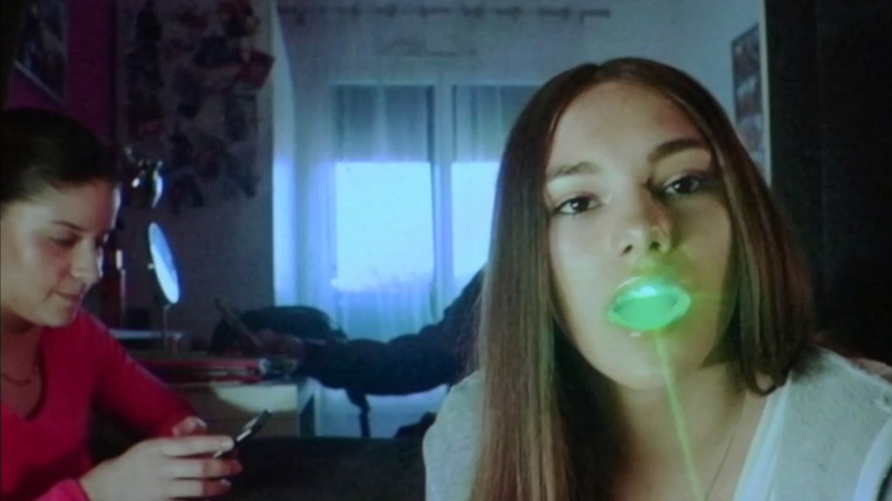 One of the three girls looks directly at the audience but still only sees the screen in front of her. She tells of a presentation video on TikTok where a woman promises to “make dreams more real.” With her method, one can “listen to a heartbeat” for hours. She'd rather not do that. “You have to pay merely to sleep and rest” the girl says. She is also captured by a laser dot and tries to swallow it.
