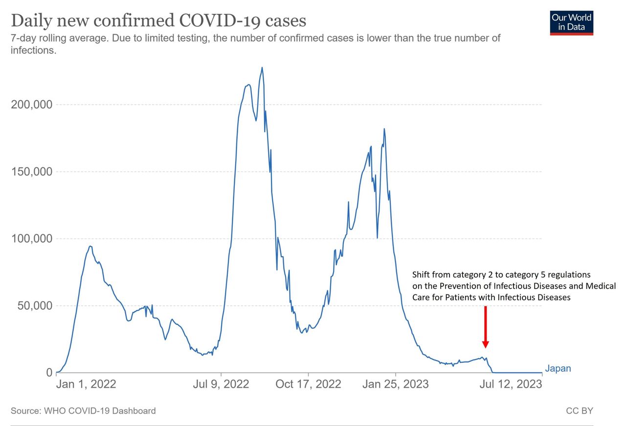 In line with the WHO’s abrupt and unscientific declaration of an end to the Public Health Emergency of International Concern (PHEIC) in early May, the Japanese government rapidly moved to downgrade the surveillance category of COVID-19 from a Class 2 to a Class 5 disease, equivalent to a seasonal influenza. This prompted a shift to sentinel surveillance in which case counts are no longer reported, similar to recommendations that were made by the European and US Centers for Disease Control and Prevention (CDC).