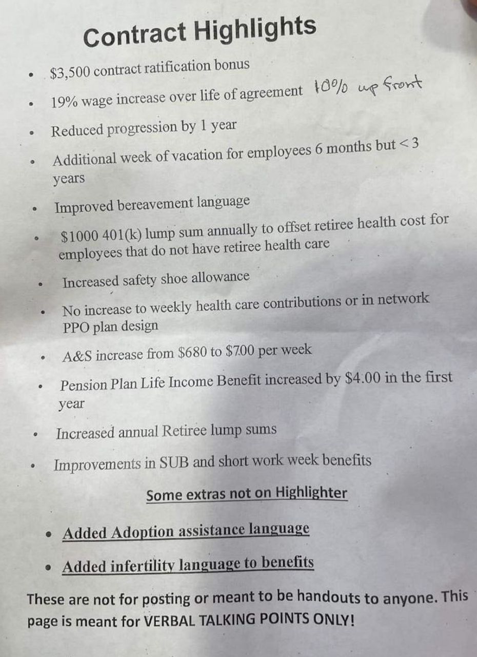 At the top of the list on the highlights sheet is a $3,500 signing bonus. Its placement is not accidental. This is standard operating procedure for the UAW, a sweetener to induce financially strapped workers to sign off on rotten contracts. As one worker pointed out on social media, for most workers taxes will slash the miserly bonus by about one-third.