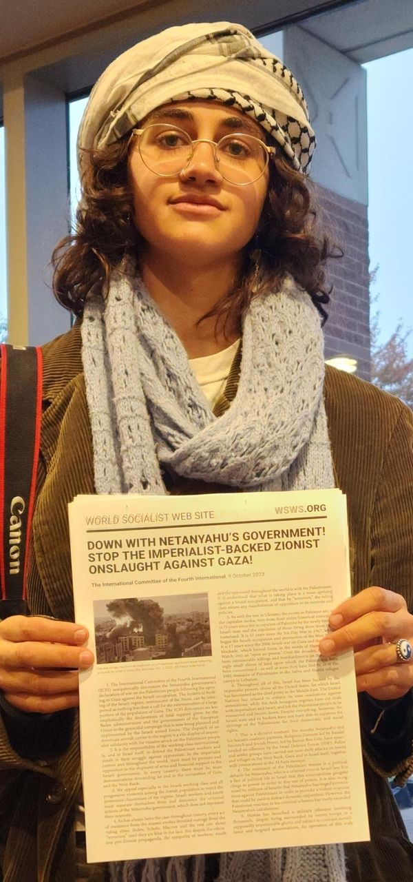 A Lebanese-American woman attending the rally told the WSWS she supported the struggle of the Gazans. “As for Joe Biden and all the congressmen and women, for leaders all over the world, you have to stand up for what is right or you don’t know the meaning of dignity, of humanity.
