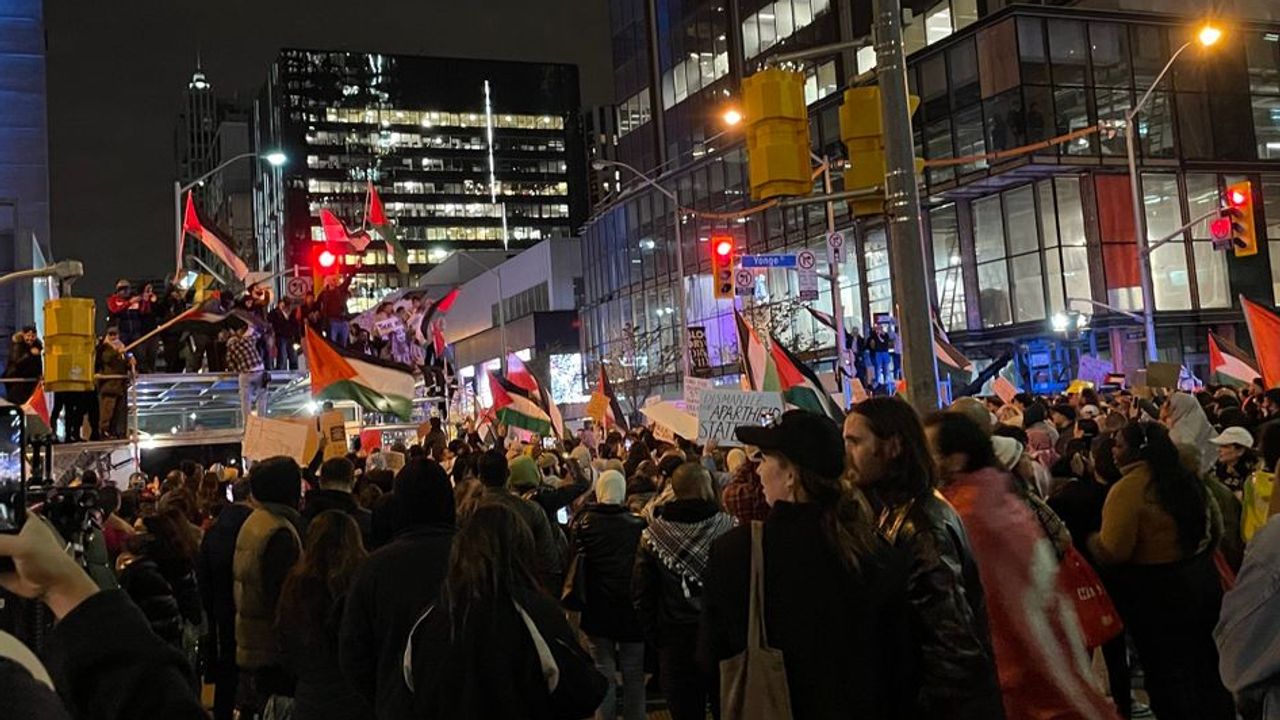 Demonstrators carrying the Palestinian flag and chanting “Free, free Palestine,” shut down the major Yonge and Bloor intersection for several hours under the surveillance of hundreds of riot police, who ultimately arrested one person on unspecified charges.