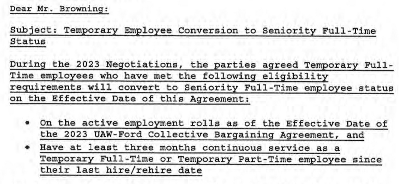 The UAW-Ford contract “change pages” reveal that only temporary full-time workers (TFTs) with 90 days of “continuous service” are set to be converted to regular, full-time employment after ratification of the contract.