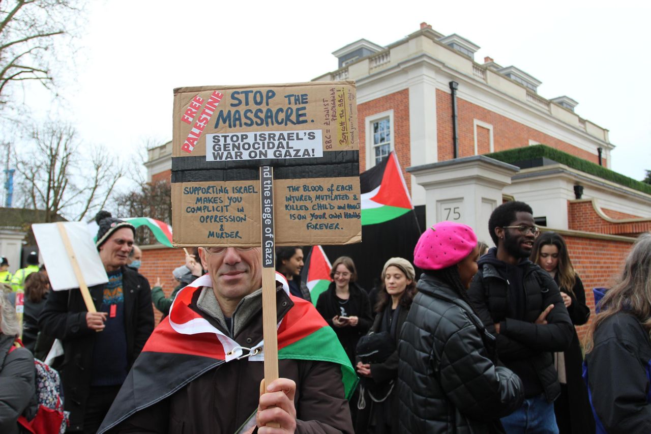 Marcus said of the Labour Party that its position was criminal: “And hopefully they are all going to be prosecuted. My sign says, ‘Supporting Israel makes you complicit’. So politicians and organisations like the BBC are complicit. Just yesterday they read out the names of the three hostages killed by the Israeli army; they never read the names of all the Palestinians killed, not even the children, they are forgotten. All the focus is on the Israeli victims and their families, how they need support. They are still alive; 20,000 Palestinians are not.”
