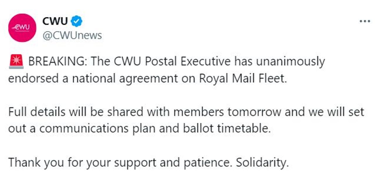 In a three-sentence statement released May 2, the Communications Workers Union (CWU) Postal Executive announced it had reached an agreement with Royal Mail for members in Fleet, the company’s maintenance division.