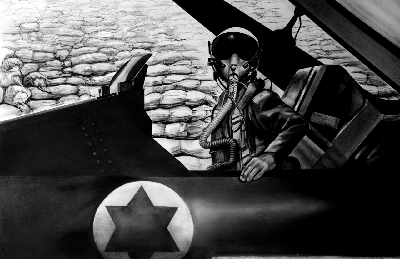 The drawing features a pilot in an aircraft, emblazoned with the Star of David, and in the background, a mass of bodies in burial shrouds. Sandle (born 1936) is a member of the Royal Academy and a well-regarded sculptor and artist, known for his anti-war and anti-establishment pieces. He has been exhibited internationally and his works are held by museums and galleries in the US, Brazil, Germany, France, Japan, Australia and other countries, as well as the UK.