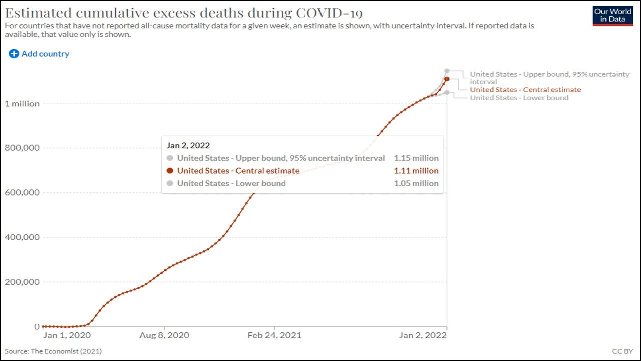 J. Scott Davison, director ejecutivo de la compañía de seguros OneAmerica, hablando en una conferencia de atención médica organizada por la Cámara de Comercio de Indiana, explicó que su compañía registró las tasas de mortalidad más altas jamás vistas desde que se unió al negocio. Señaló que fue alarmante un aumento en las muertes entre las poblaciones en edad laboral. “Las tasas de mortalidad aumentaron un 40 por ciento con respecto a lo que eran antes de la pandemia”. Agregó que se podría esperar que una catástrofe que ocurre una vez cada 200 años cause un aumento del 10 por ciento con respecto a las muertes previas a la pandemia. Aunque las muertes por COVID-19 superaron las 850.000 en los EE. UU. en el nuevo año, el exceso de muertes oscila entre 940.000 y 1,2 millones.