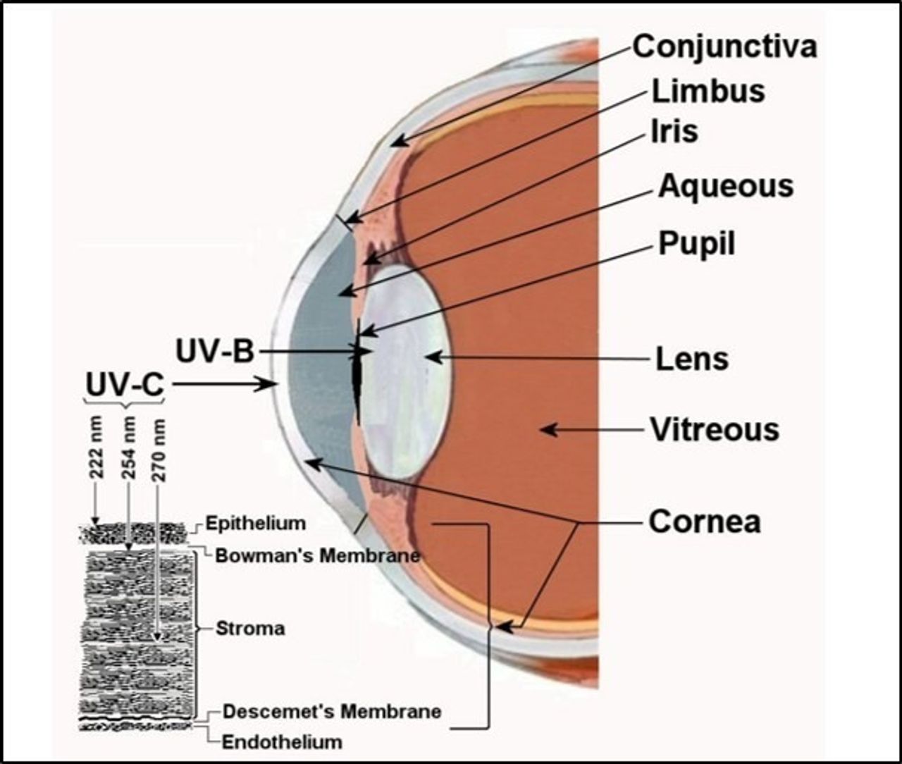 Penetración de las longitudes de onda UV en el ojo humano. [Photo: International Ultraviolet Association]