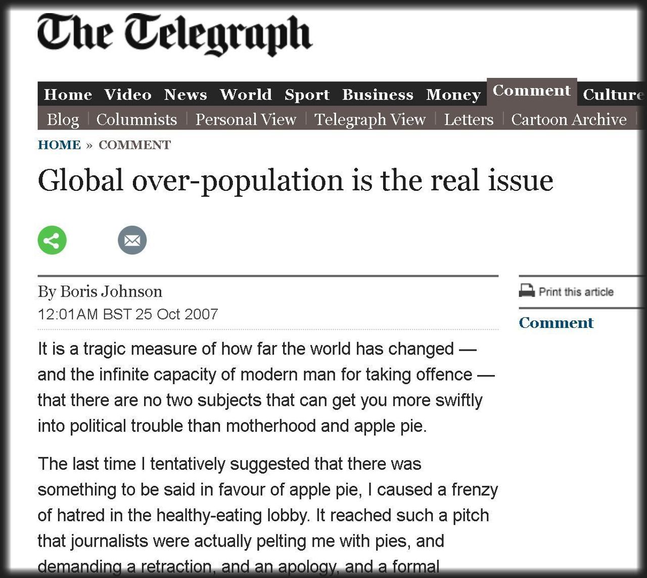 O que isso significa, disse Johnson, é que a sociedade está “se recusando a dizer qualquer coisa sensata sobre o maior desafio que a Terra enfrenta; e não, seja o que for agora convencional dizer, o maior desafio não é o aquecimento global. O principal desafio da nossa espécie é a reprodução da nossa própria espécie.”
