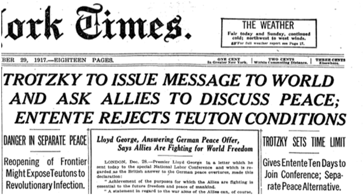 Призывы Троцкого находят поддержку в рабочих и угнетенных массах по всему миру, и это побуждает газету New York Times попытаться оправдать поведение Соединенных Штатов. Заголовок гласит: «Троцкий обращается с посланием к миру и призывает союзников начать обсуждение мира; Антанта отвергает условия тевтонов»