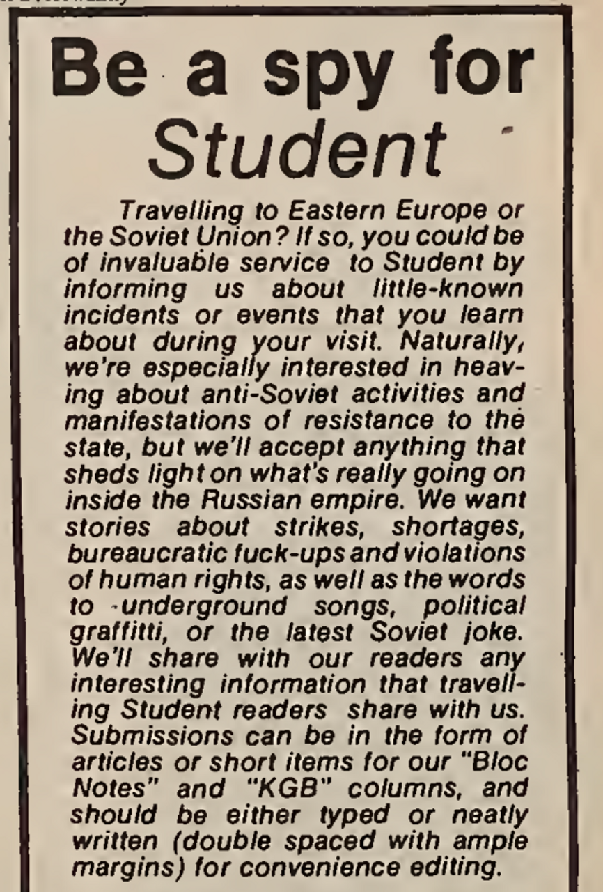 КУК сыграл ключевую роль в этой кампании. Студенческая газета прямо призывала украинских студентов, посещающих Советский Союз, стать шпионами. Одной из студенток, откликнувшихся на этот призыв, была Христя Фриланд. Это не было случайностью, поскольку семья Фриланд была заражена идеологией украинского национализма и имела давние связи с газетой Студент, которая с энтузиазмом пропагандировала миф о том, что Бандера и УПА были борцами за «национальное освобождение». Ее тетя, Христя Хомяк, работала редактором Студента с 1969 по 1970 год.