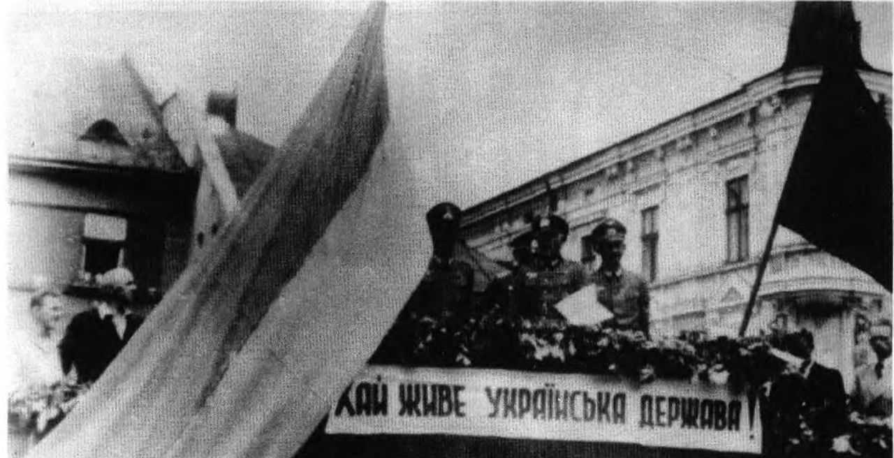 ОУН(б) и нацистские чиновники на совместном параде в оккупированной Польше 7 июля 1941 года (копия оригинального документа пропагандистского отдела ОУН(б). Jo0doe, Public domain, via Wikimedia Commons)