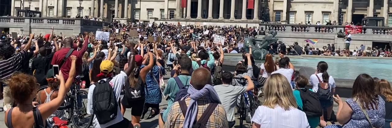 ඉරිදා සවස ලන්ඩනයේ ඩව්නිං වීදිය හරහා පාර්ලිමේන්තුව තෙක් විරෝධතා පෙලපාලි දැක්වීම සදහා දහස් ගනනක් ට්රැෆල්ගර් චතුරස්රයට රැස් වූහ. බැටර්සියා ප්රදේශයේ නයින් එල්ම්ස් හි එක්සත් ජනපද තානාපති කාර්යාලය අසල විරෝධතා දැක්වීම සදහා ඔවුහු තේම්ස් නදිය තරනය කලහ. විරෝධතාකරුවෝ “යුක්තිය නැත, සාමය නැත”, “කලු ජීවිත වටින්නේය” , “මගේ නම ජෝර්ජ් ෆ්ලොයිඩ්” ආදී සටන් පාඨ කියමින් විරෝධතා දැක්වූහ. “ජෝර්ජ් ෆ්ලොයිඩ්ට යුක්තිය”, “වර්ගවාදයට තැනක් නැත” සහ “මට හුස්ම ගන්න බැහැ” යන සටන් පාඨ සහිත බැනර් ද ඔවුහු රැගෙන ගියහ.