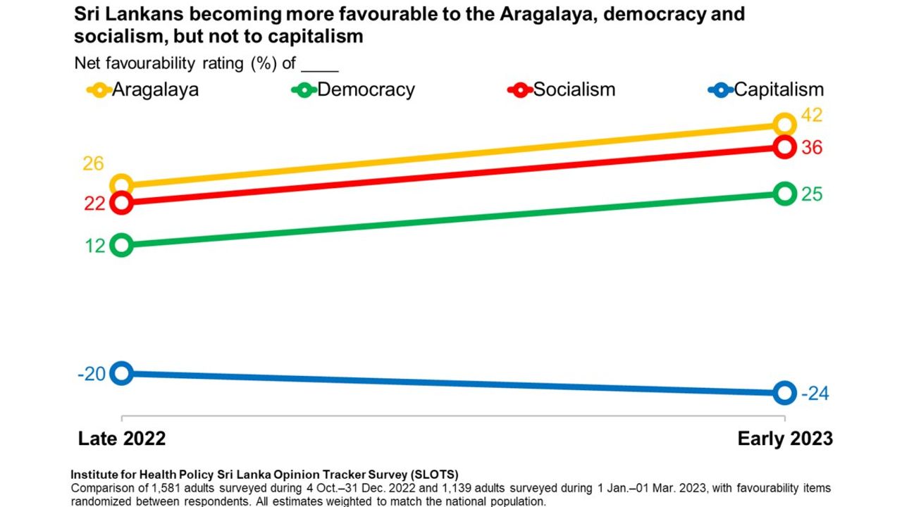 “ප්‍රජාතන්ත්‍රවාදය, අරගලය සහ සමාජවාදය පිලිබඳව ලාංකිකයින් අතර ධනාත්මක අදහස් වර්ධනය වෙමින් පවතින නමුත් ධනවාදය පිලිබඳ අදහස් සෘනාත්මක දෙසට ගමන් කරමින්” පවතින බව වාර්තාව පවසයි. ඊට අනුව 2022 අවසන් භාගයේ සිට 2023 මුල් භාගය වනවිට සමාජවාදය පිලිබඳ සහයෝගය ඒකක 14කින් වැඩි වී ඇත. නමුත් ධනවාදය පිලිබඳ පිලිකුල ඒ කාලය තුල ඒකක 4කින් වර්ධනය වී ඇත. අරගලය සඳහා පවතින සහයෝගය ඒකක 16කින් වැඩි වී ඇත.