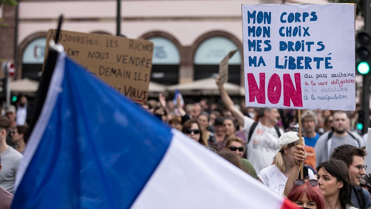 மக்ரோன் அரசாங்கத்திற்கு எதிராக பரந்த மக்களின் கோபம் உள்ளது, ஆனால் இது மக்ரோனின் 'சுகாதார அனுமதி நுழைவுச் சீட்டுக்கு' எதிரான எதிர்ப்புக்களின் தோற்றத்தை பொய்யாக்குதல் ஆகும். LO கூறுவதற்கு மாறாக, இந்த எதிர்ப்பு ஆர்ப்பாட்டங்கள் அதிவலது (மரியோன் மரெசால் லு பென், பிலிப்போ மற்றும் டுபான்ட்-அய்னன் உட்பட) மற்றும் ஜோன்-லூக் மெலோன்சோனின் அடிபணியா பிரான்ஸ் கட்சிக்குள் இருக்கும் சுதந்திரவாதிகளான பிரான்சுவா ரூஃபான் போன்றவர்களால் தொடங்கப்பட்டன. அவர்கள் பெருந்தொற்று நோய்க்கு எதிரான ஒரு விஞ்ஞானரீதியான சுகாதார கொள்கையை எதிர்க்கின்றனர்.
