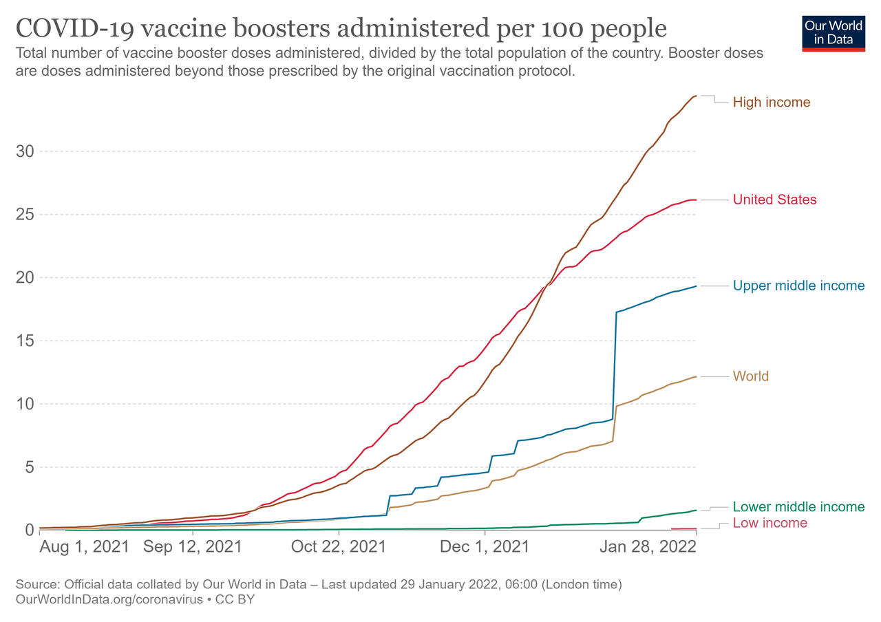 விநியோகிக்கப்பட்ட 10 பில்லியன் கோவிட் தடுப்பூசிகளில், அண்ணளவாக 1 பில்லியன் தடுப்பூசிகள் பூஸ்டர்களாக வழங்கப்பட்டுள்ளன. உயர் வருமானம் மற்றும் உயர் நடுத்தர வருமானம் கொண்ட நாடுகள் 898 மில்லியனுக்கும் அதிகமான மூன்றாவது அளவுகள் (மற்றும் நான்காவது அளவுகள்) தடுப்பூசிகளின் பெரும் பங்கைப் பெற்றுள்ளன. இருப்பினும், நோயெதிர்ப்பைத் தவிர்க்கும் ஓமிக்ரோன் மாறுபாடு பரவி வரும், மற்றும் மூன்றாவது அளவு தடுப்பூசியும் போடப்பட்டால் தான் முழுமையாக தடுப்பூசி போடப்பட்டதாக கருதப்பட வேண்டியதன் சூழலில், அதன் விளைவு உலக மக்கள்தொகையில் 11 சதவீதத்திற்கும் அதிகமானவர்கள் இப்போது முழுமையாக தடுப்பூசியை பெற்றுள்ளதாகக் கருதலாம். அமெரிக்கா அதன் மக்கள்தொகையில் கால் பகுதியினருக்கு மட்டுமே பூஸ்டர் தடுப்பூசி வழங்கியுள்ளது, அதே நேரத்தில் ஐரோப்பிய ஒன்றிய நாடுகள் பாதியளவை நெருங்கி வருகின்றன.