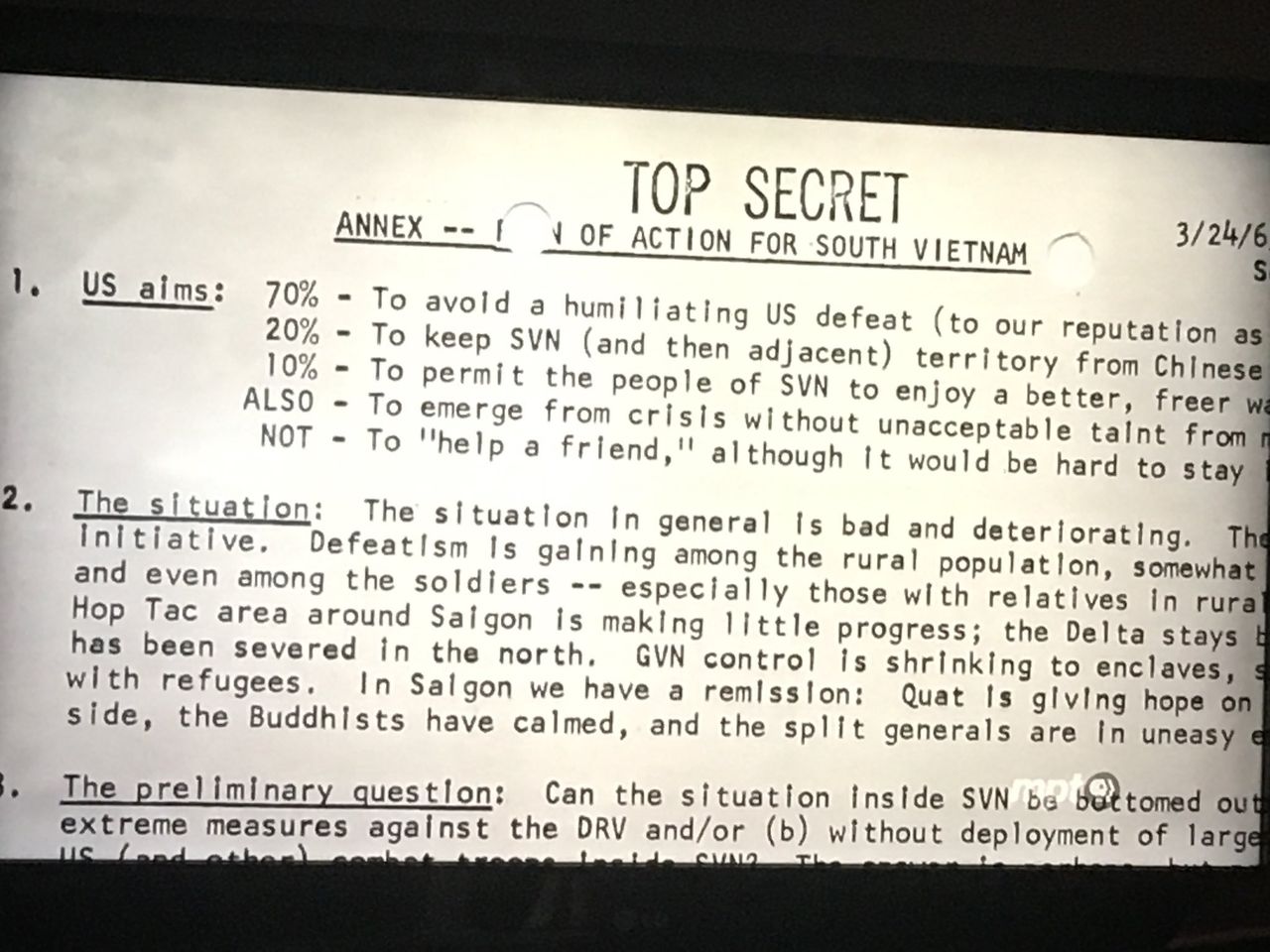 பென்டகன் ஆவணங்களின் மிகவும் அதிர்ச்சியூட்டும் அம்சங்களில் ஒன்று என்னவென்றால், 1965 இல் தயாரிக்கப்பட்ட ஓர் உள்அலுவலக பாதுகாப்புத் துறை குறிப்புரையானது, அமெரிக்காவின் 'கடமைப்பாட்டை' நிலைநிறுத்துவதே அமெரிக்க தலையீட்டுக்கான முக்கிய காரணம் என்றும், இதை மீறுவது 'அவமானகரமான அமெரிக்க தோல்விக்கு' வழிவகுக்கும் என்றும் தீர்மானித்திருந்தது. அமெரிக்க இலக்குகள் பின்வருமாறு பட்டியலிடப்பட்டன: