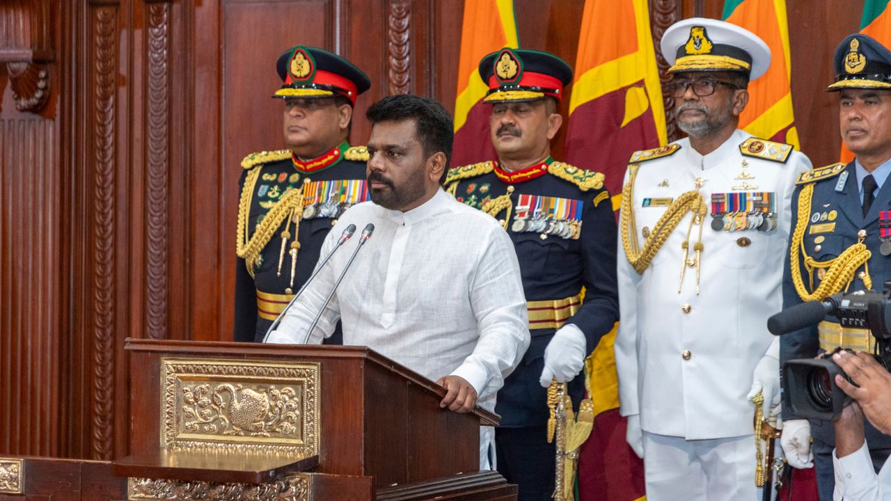 23 செப்டம்பர் 2024 திங்கட்கிழமை, இலங்கையின் கொழும்பில் உள்ள இலங்கை ஜனாதிபதி அலுவலகத்தில் பதவிப் பிரமாணம் செய்து கொண்ட பின்னர், இலங்கையின் புதிய ஜனாதிபதி அனுரகுமார திசாநாயக்க, ஒரு கூட்டத்தில் உரையாற்றுகையில், பாதுகாப்புப் படைகளின் தளபதிகள் பின்னால் நிற்கின்றனர் [AP Photo/Sri Lankan President's Office]
